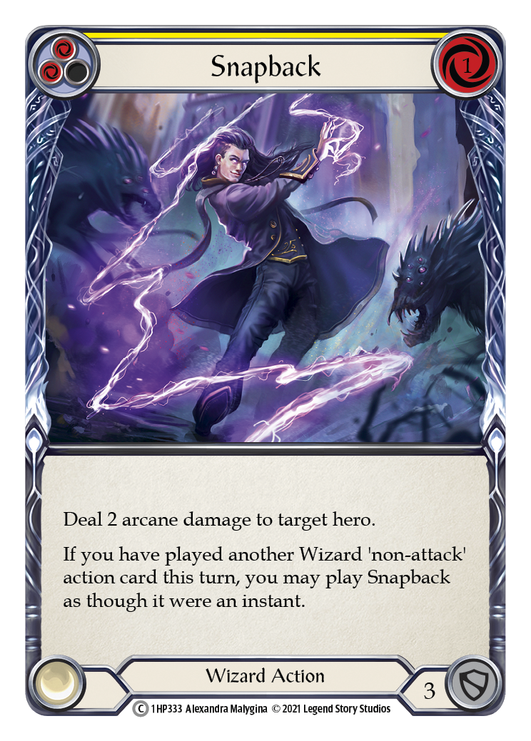 Deal 2 arcane damage to target hero. If you have played another Wizard 'non-attack' action card this turn, you may play Snapback as though it were an instant.